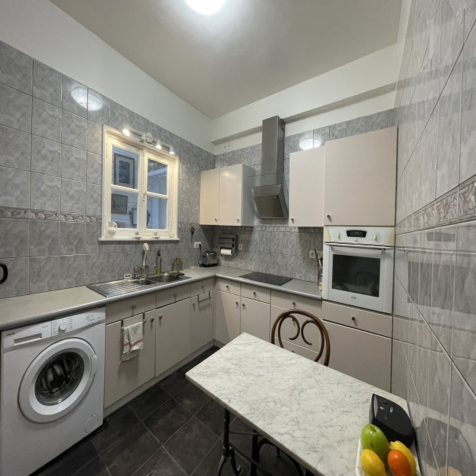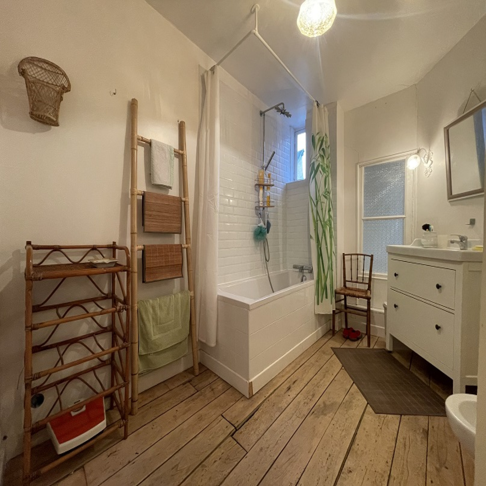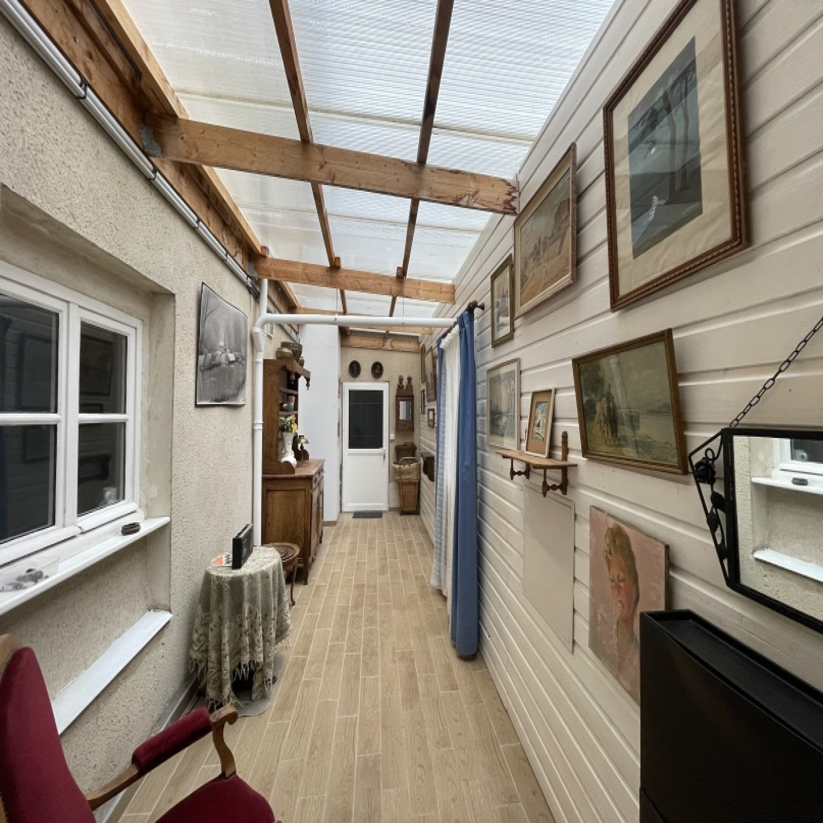 RDC: Patio lumineux, entrée donnant accès à un beau salon-séjour de 33 m² (parquets, poutres et cheminée), une cuisine aménagée & séparée / WC.