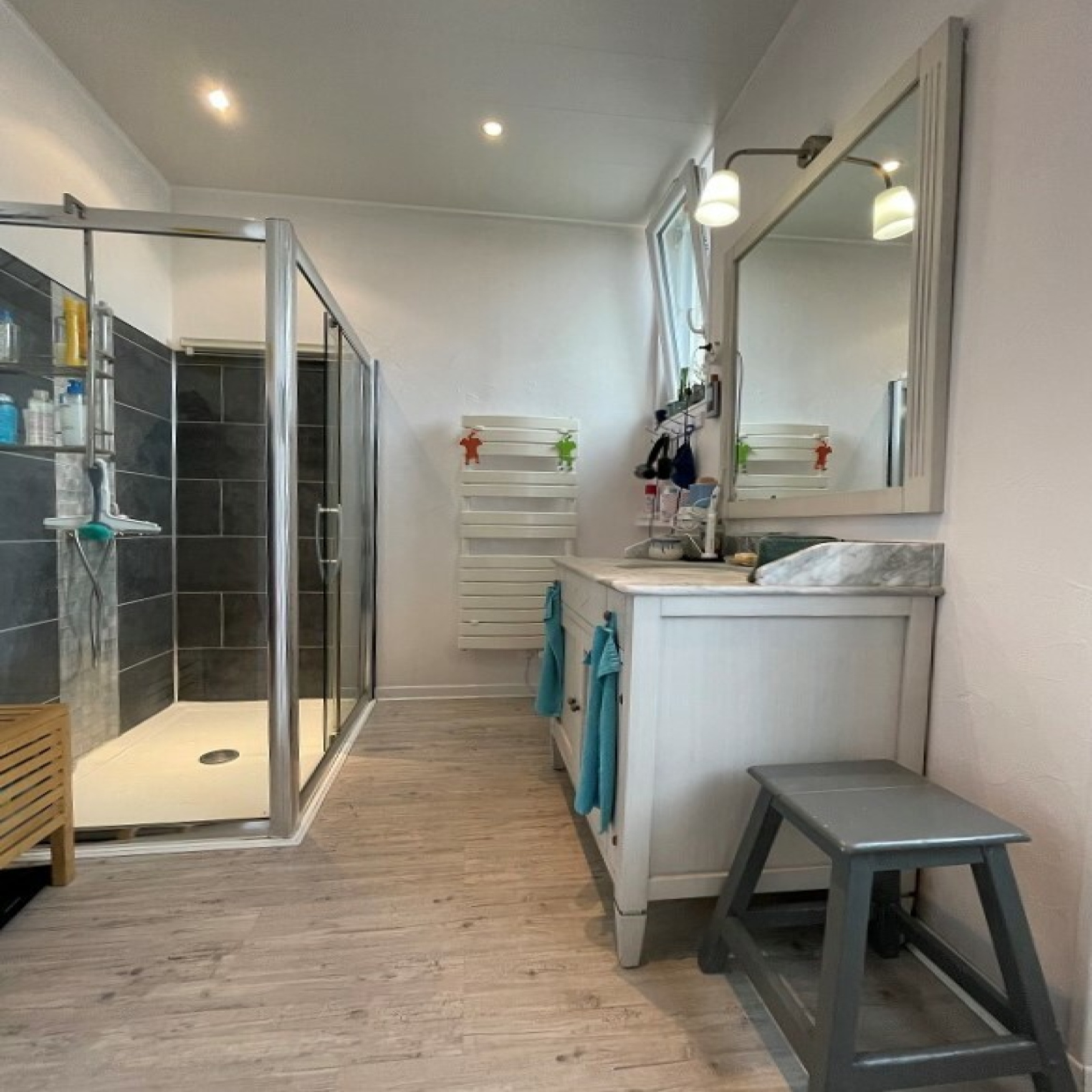 RDC : Entrée avec Vestiaire / Salon-séjour / Cuisine Aménagée et Équipée (Hotte plaque Four Lave-vaisselle) / Salle d’eau / WC avec lave mains.