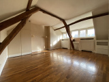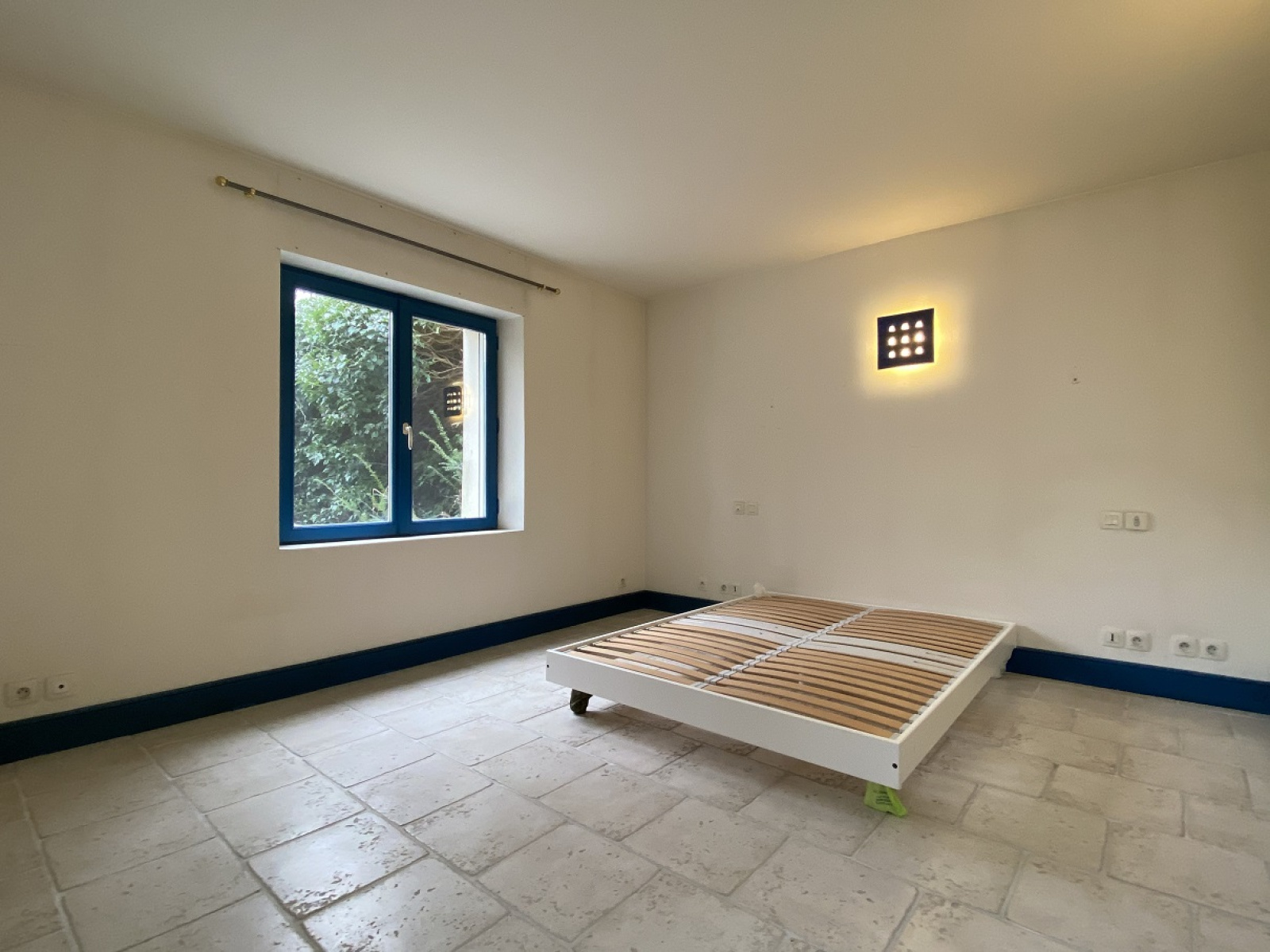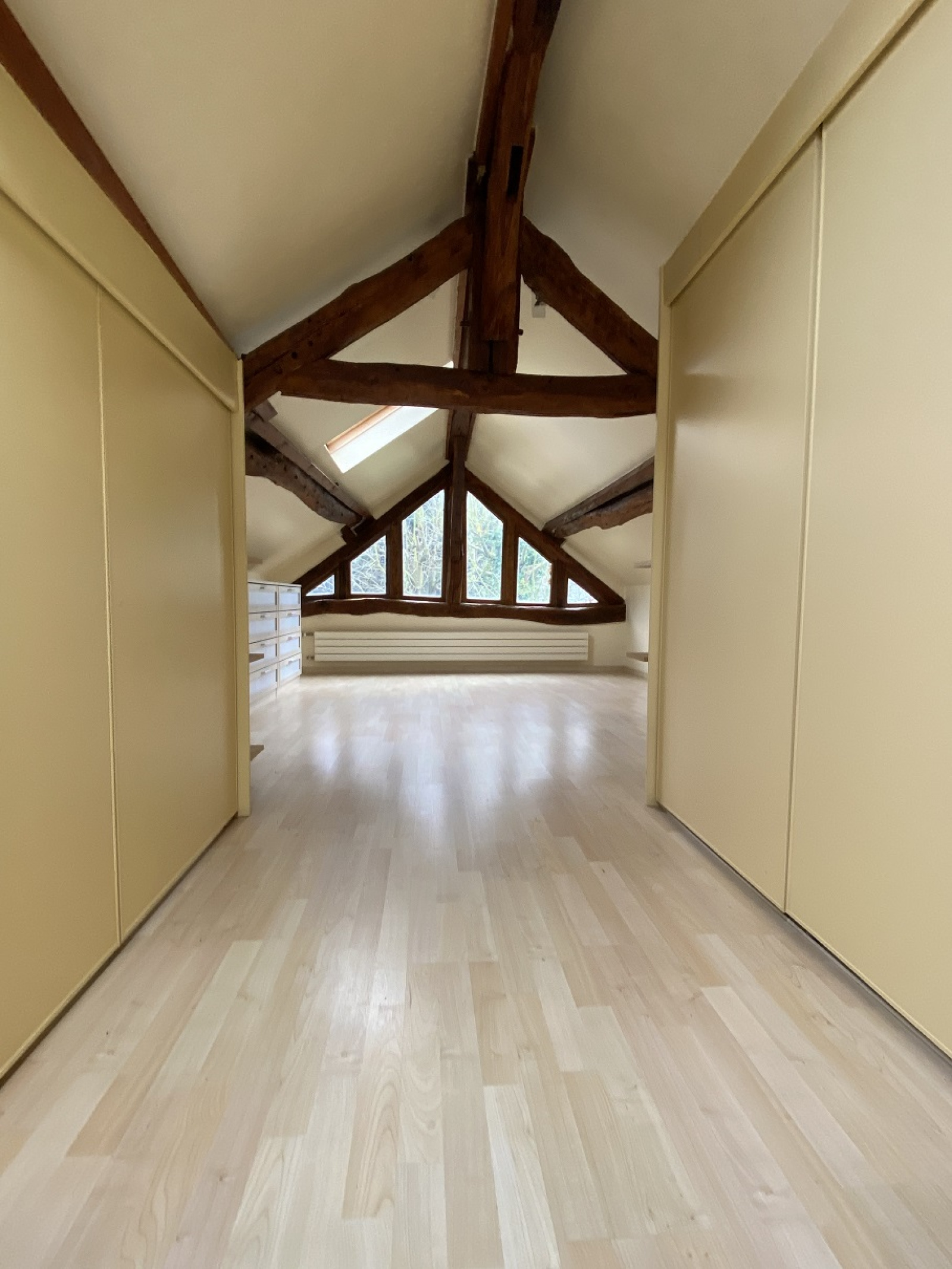 Au dernier étage : une grande chambre avec vue jardin, salle de bains et toilettes.