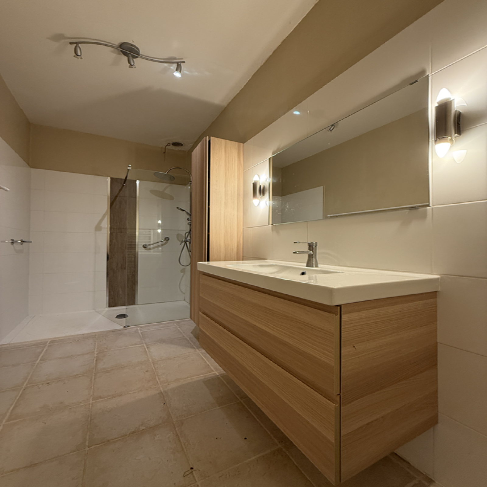 Au RDC : Salon-séjour (Insert) / Une cuisine récente aménagée et équipée / Une salle d'eau neuve / Chambre / WC