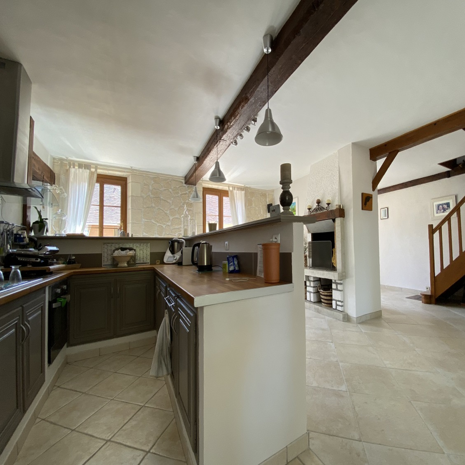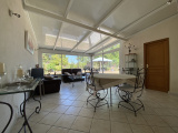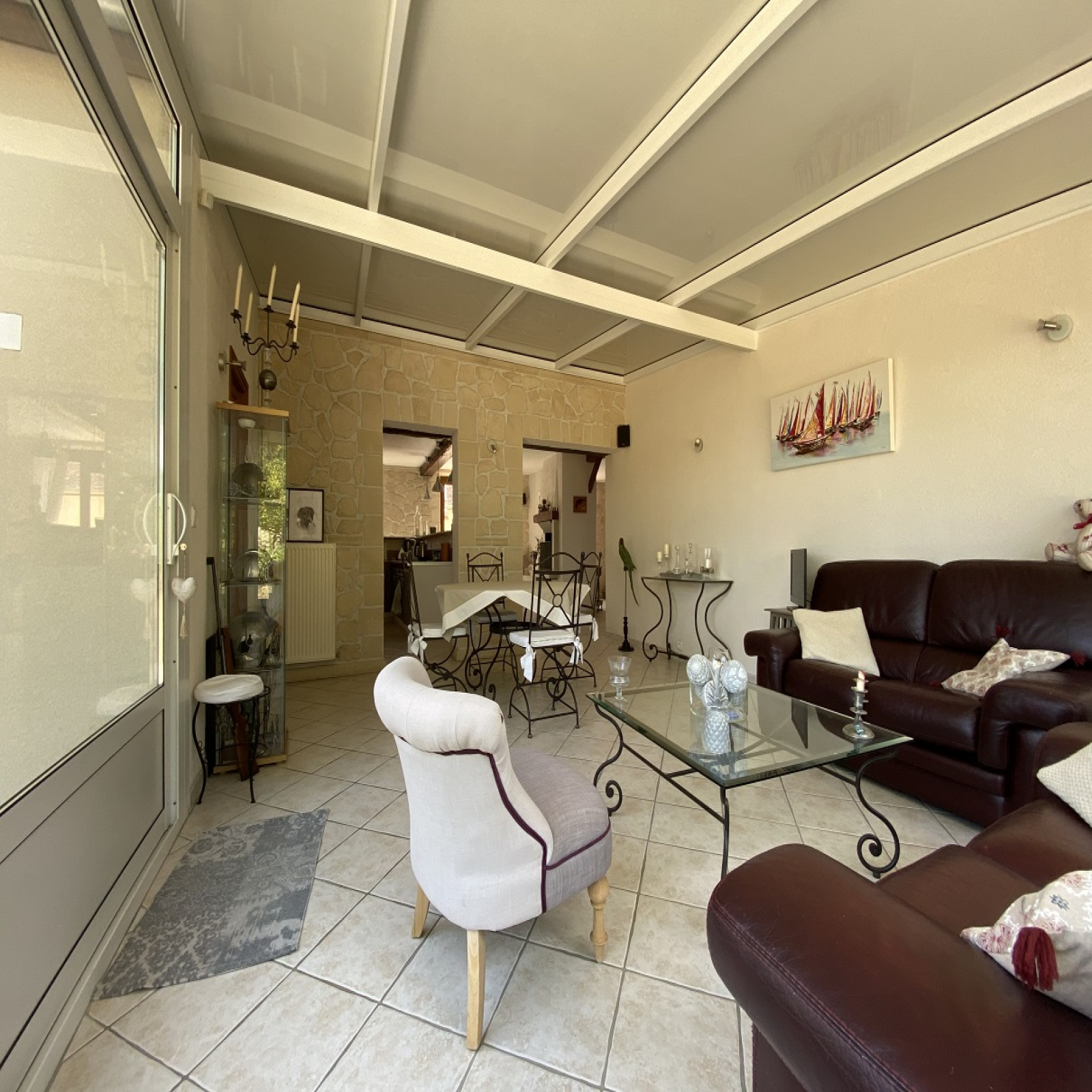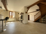 Belle maison ancienne entièrement rénovée avec beaucoup de goût comprenant, une belle entrée avec placards, cuisine équipée donnant sur un espace repas avec cheminée, une véranda-salon donnant sur un jardin clos, une salle d'eau, un WC, une grande chambre et une pièce buanderie-chaufferie.