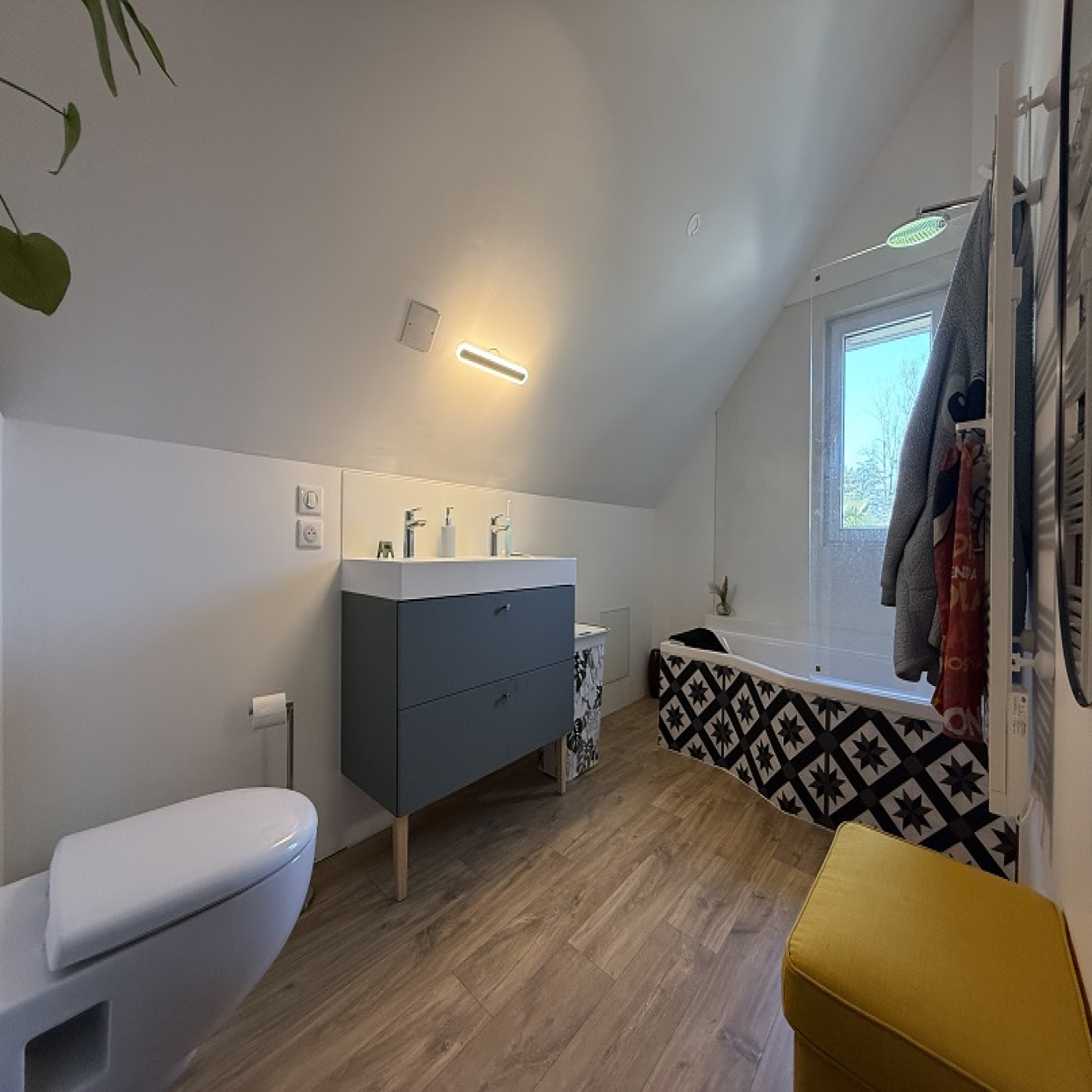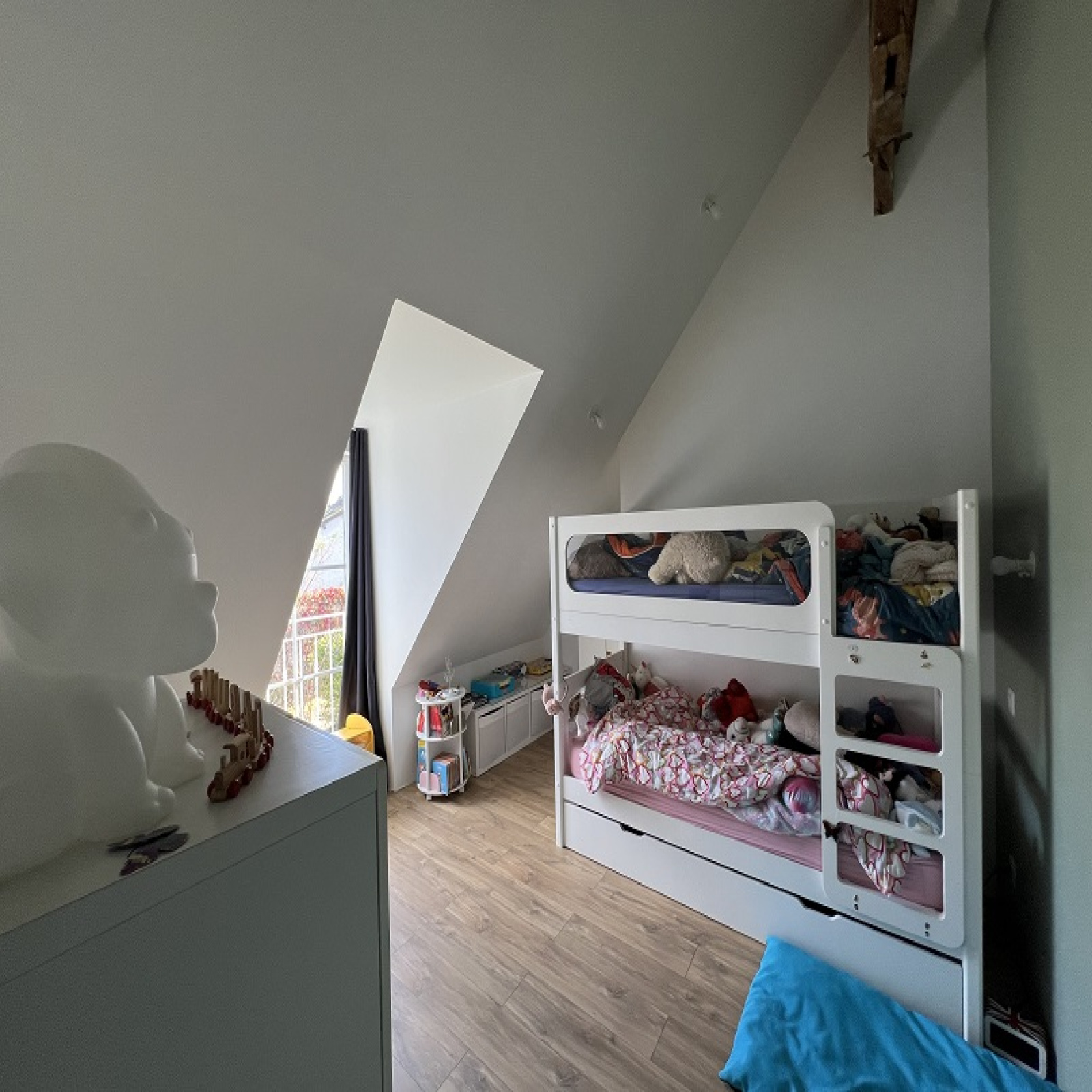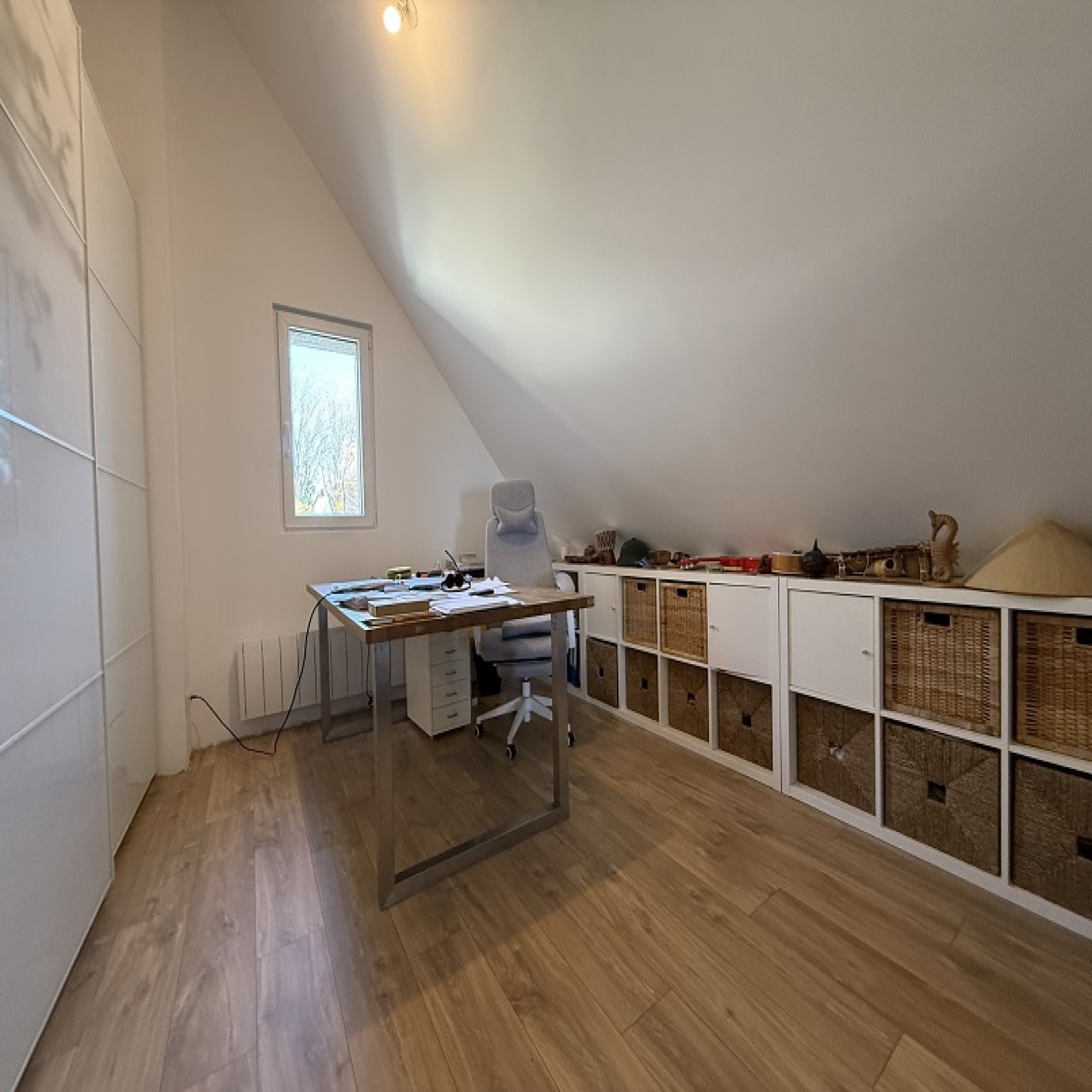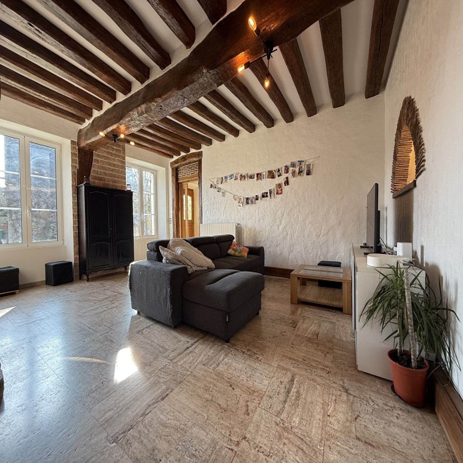 De l'autre : Entrée, cuisine et espace repas, salle d'eau avec wc et 3 chambres.