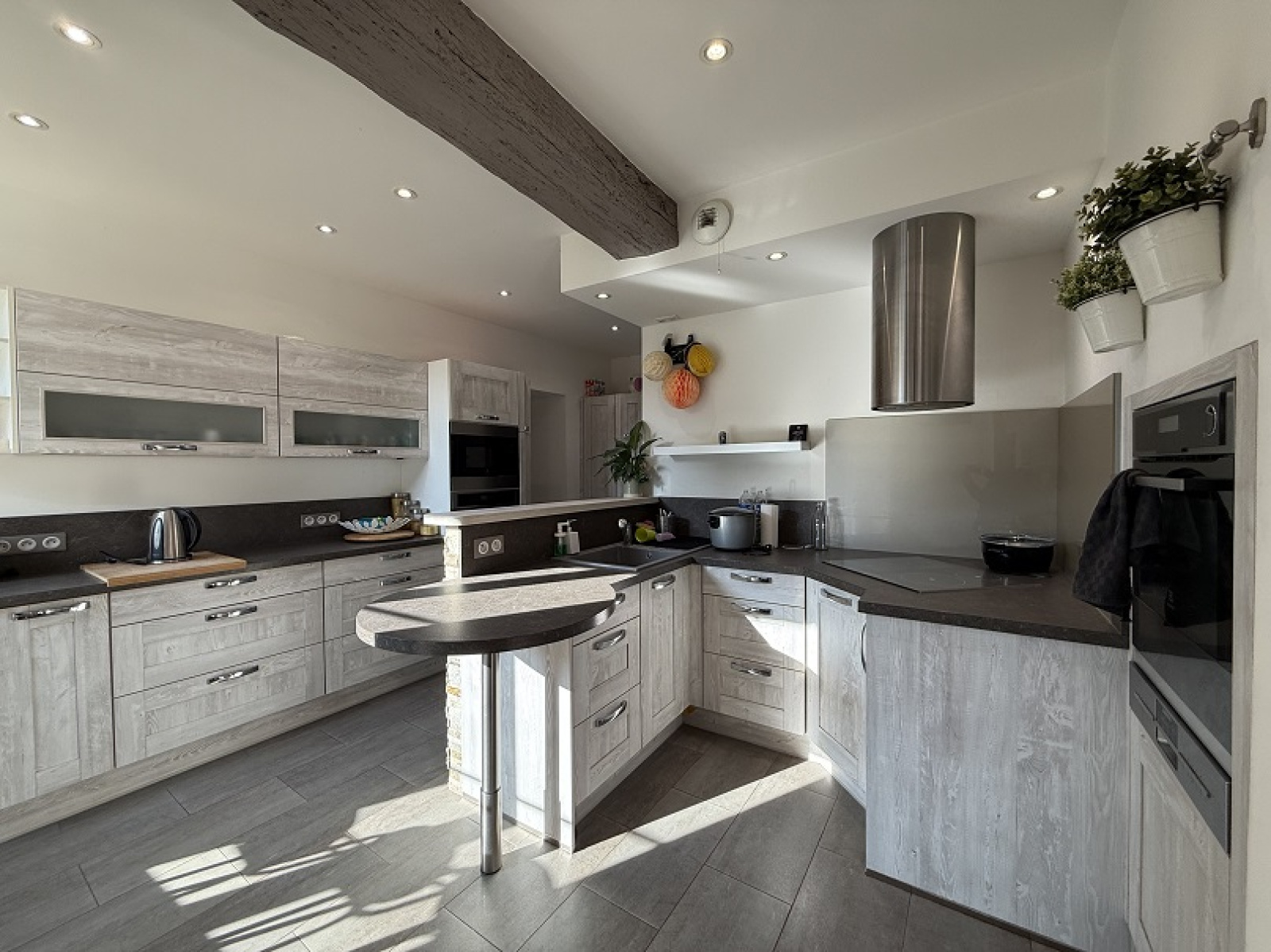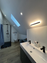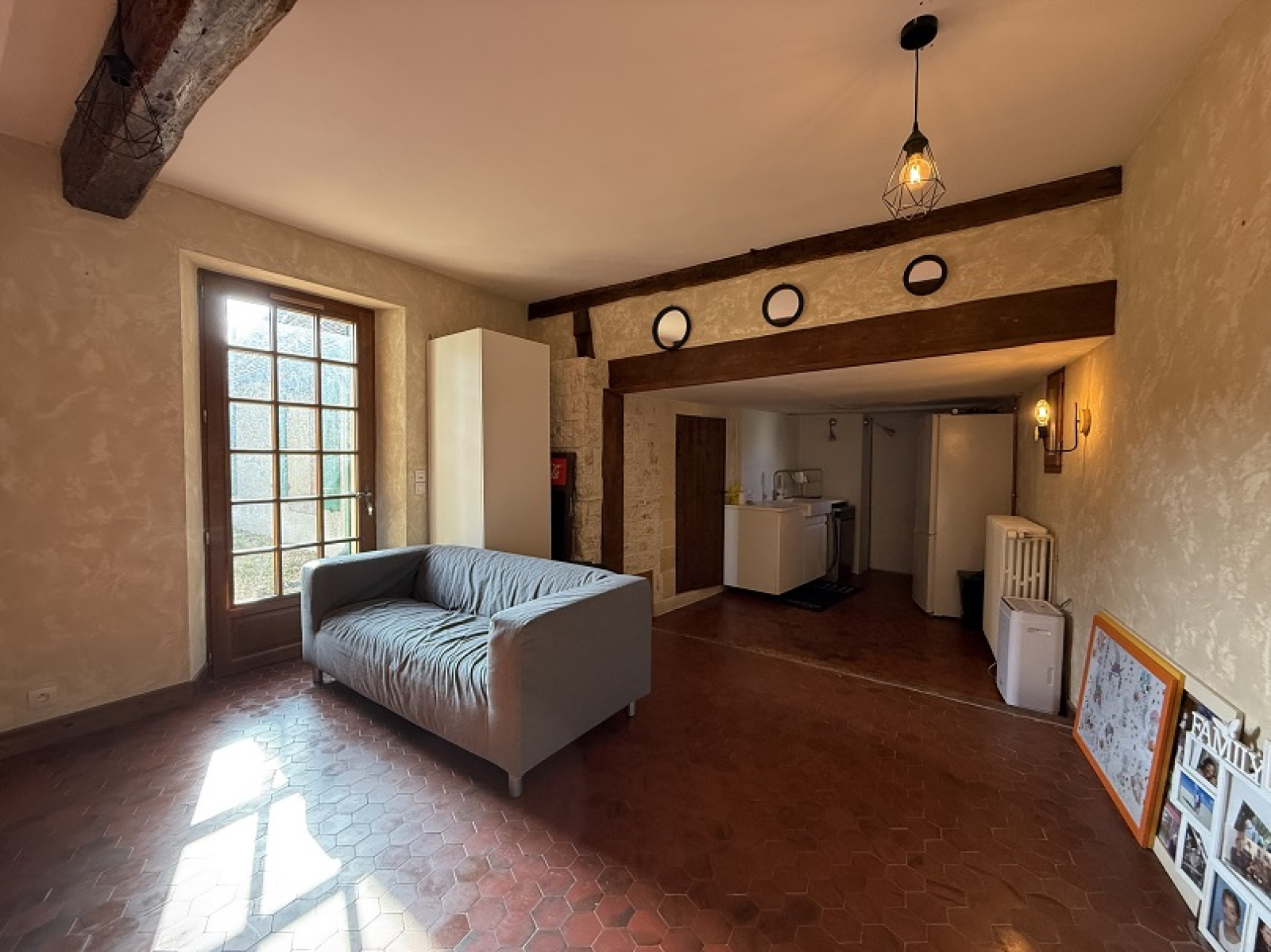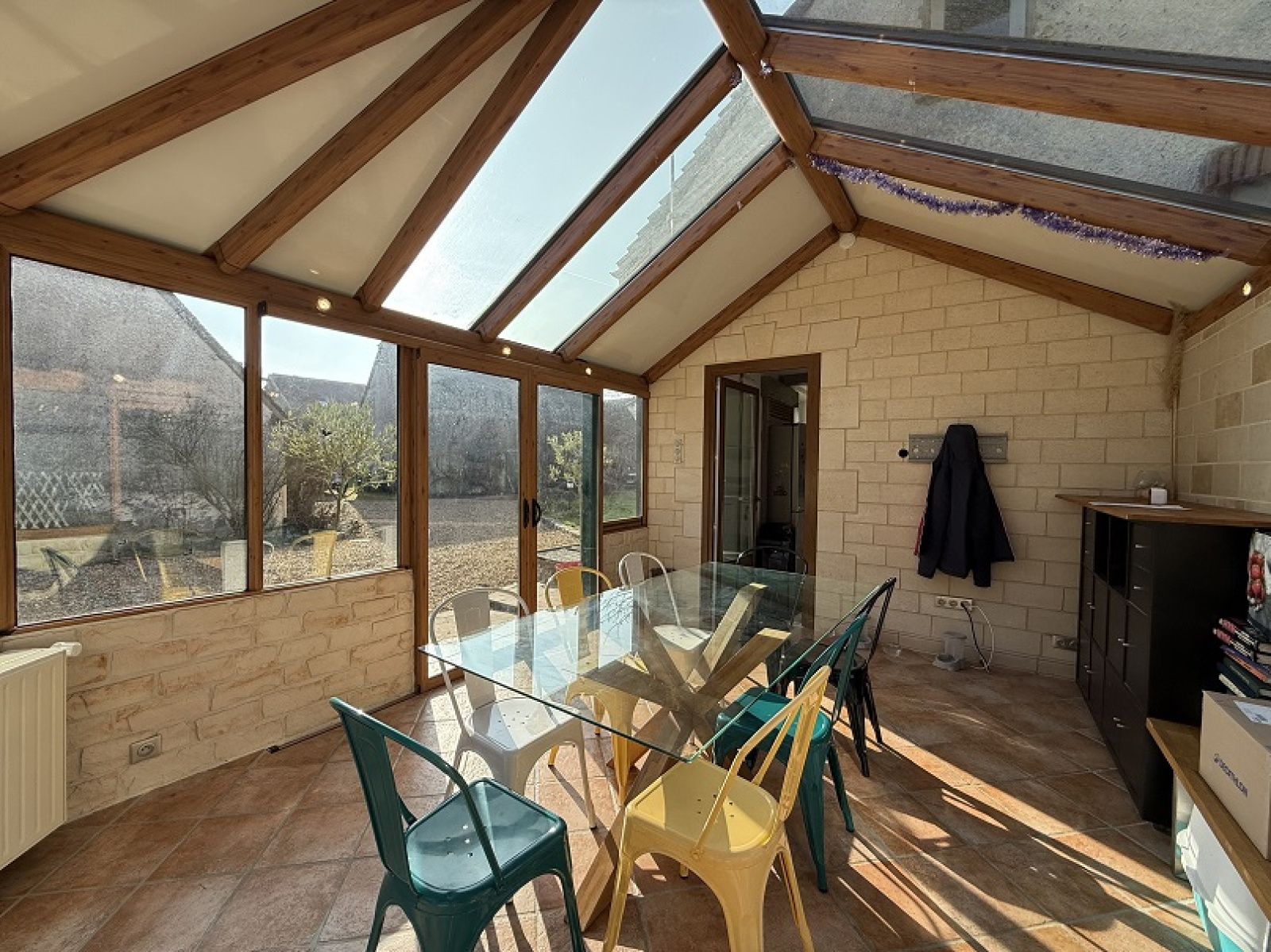 Grande entrée desservant d'un côté : Bureau (cheminée), salon (poêle à bois), wc, salle d'eau et buanderie, cuisine aménagée et équipée et véranda donnant sur le jardin.