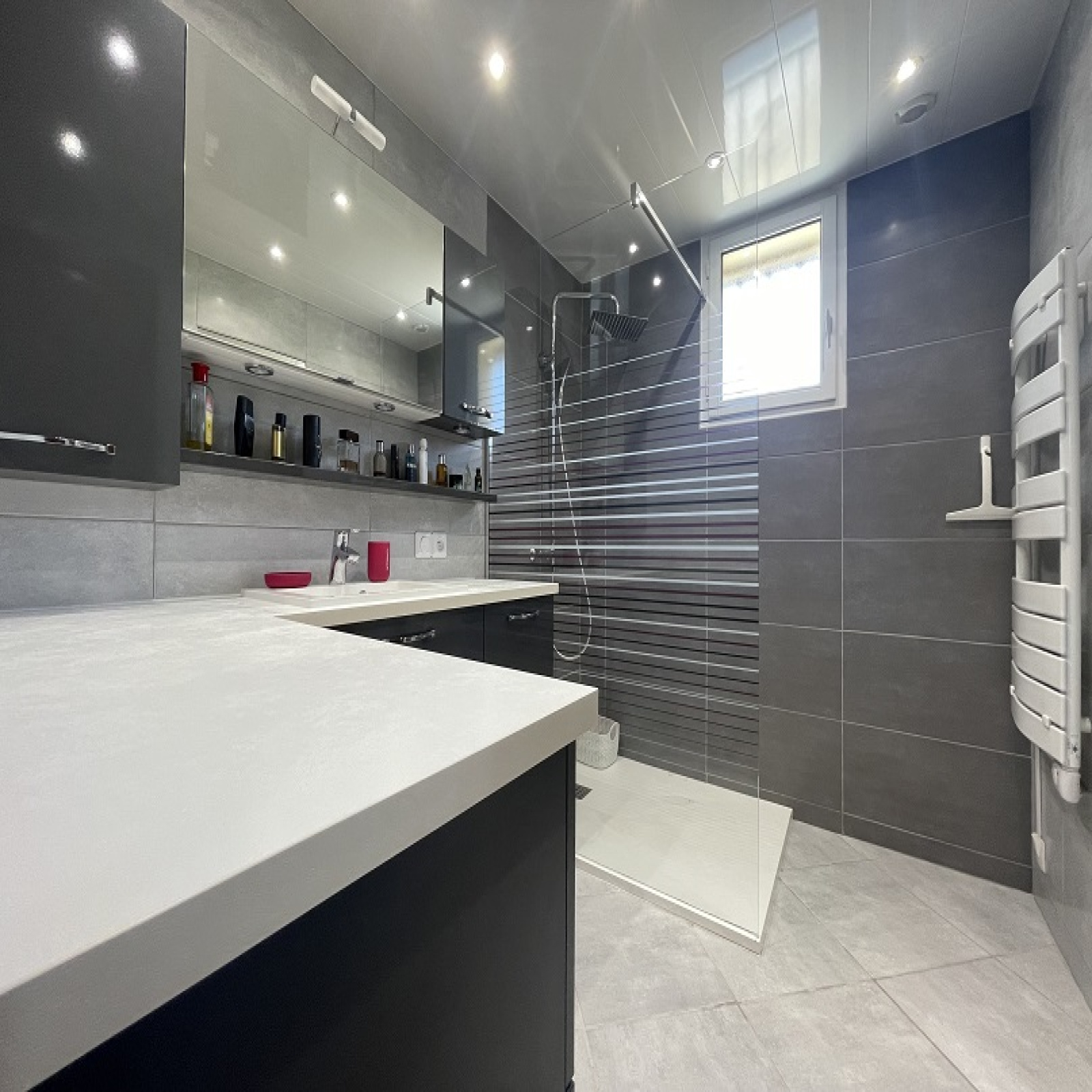 RDC : Entrée, cuisine aménagée et équipée donnant sur terrasse, beau séjour-salon, 2 Chambres, 1 bureau, Salle d'eau récente, WC.